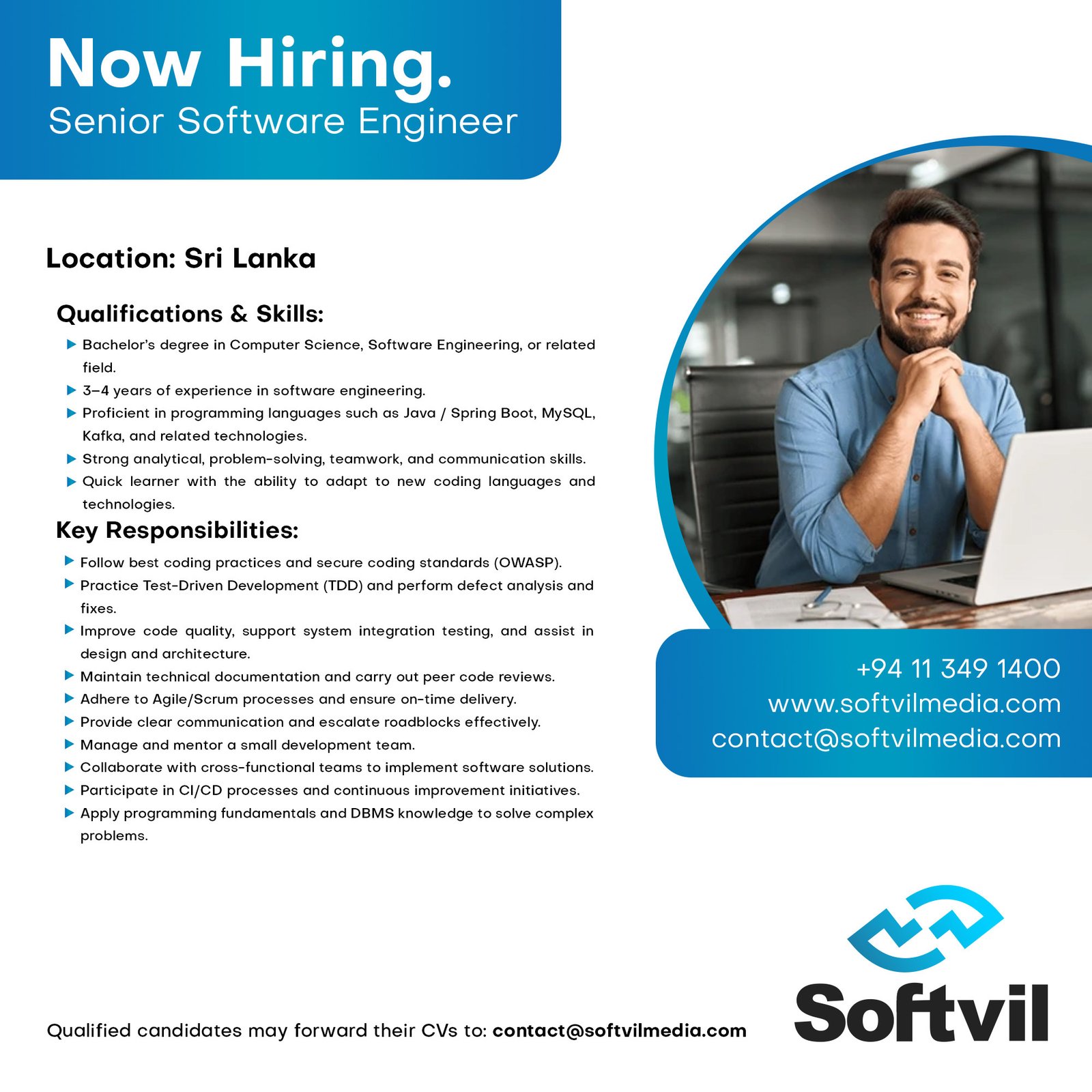 Senior Software EngineerMAIN RESPONSIBILITIESPractice best coding practices defined by software managementPractice Follow secured coding practices defined by OWASAPPractice Test driven developmentDefect analysis and fixingCode improvementsSupport System Integration TestingPractice Technical DocumentationAssist design and architectureAdhere to Agile processOn-time deliveryClear visibility, communication and escalation of road blockersCarry out peer reviews.Manage small development teamQUALIFICATIONS/ SKILLS/ KNOWLEDGEBachelor’s degree in computer science, Software Engineering, or related field or BSc equivalent qualification.3 to 4 years of experience in software Engineering.Strong analytical, problem-solving, teamwork and communication skillsExperience with one or more general purpose programming languages:Senior Engineer with MS & Service Management | MySQL, Software Engineering | Java/ Spring boot, Systems & Solutions | Java/ Spring boot, Systems & Solutions | KafkaGood understanding on Scrum and Agile practices.Ability to learn other coding languages and technologies in a short timeStrong understanding of programming fundamentals and conceptsStrong understanding of DBMSs.Experience in CI (Continues Integration)Good Understanding on Scrum and Agile practices.